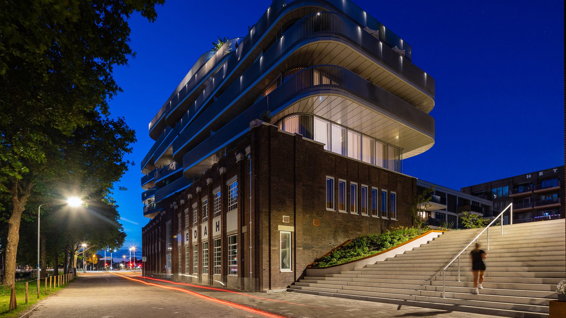 Burobol heeft voor project Oranjekade in Helmond een daklandschap van 10.000m2 ontworpen. De buitenruimte van de 265 woningen bestaat uit het nieuwe Watertorenpark, een daklandschap met twee binnenhoven en een kademilieu. Groene glooiingen met vaste planten en heesters omzomen de particuliere tuinen. Tussen het groen lopen paden van klinkers in een warme tint die uitkomen op trappen naar de kade. Het zuidelijke binnenhof is voorzien van een paviljoen, waar bewoners elkaar kunnen ontmoeten of een feestje organiseren. Het daklandschap bevindt zich boven de collectieve parkeergarage, waar bomen in de volle grond staan die met hun kronen boven het dek uitkomen. De impressies zijn vervaardigd door architectuurproducties.